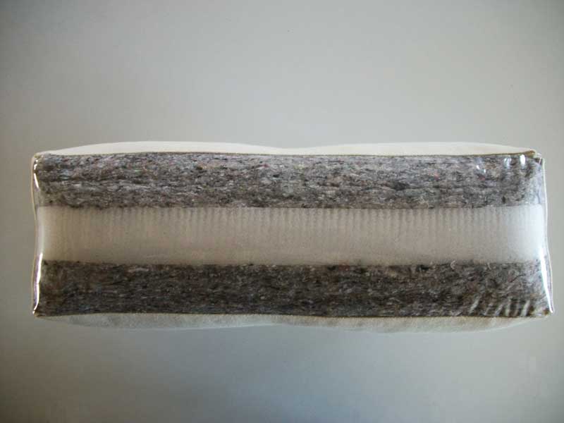 Madrassen er 75*200*12 cm. genanvendte fibre med kerne af 4 cm. skum.