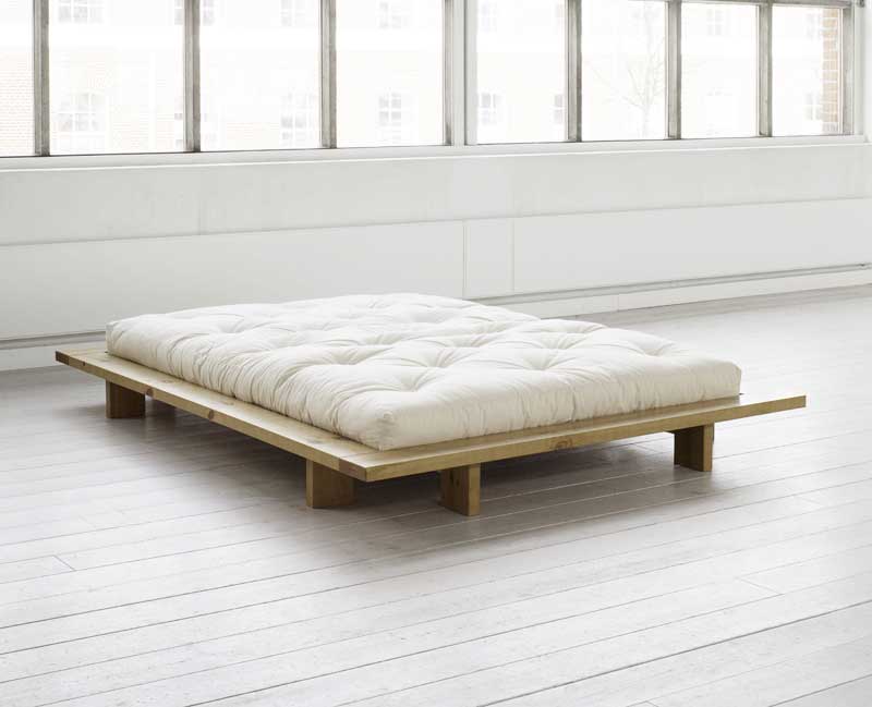 Bed frame including slatted base. The JAPAN bed frame is a classic Futon piece of furniture, fairly low and with a wide edge. the bed frame is in solid pine. The JAPAN bed is especially preferred by those who consider the Japanese healthy lifestyle.