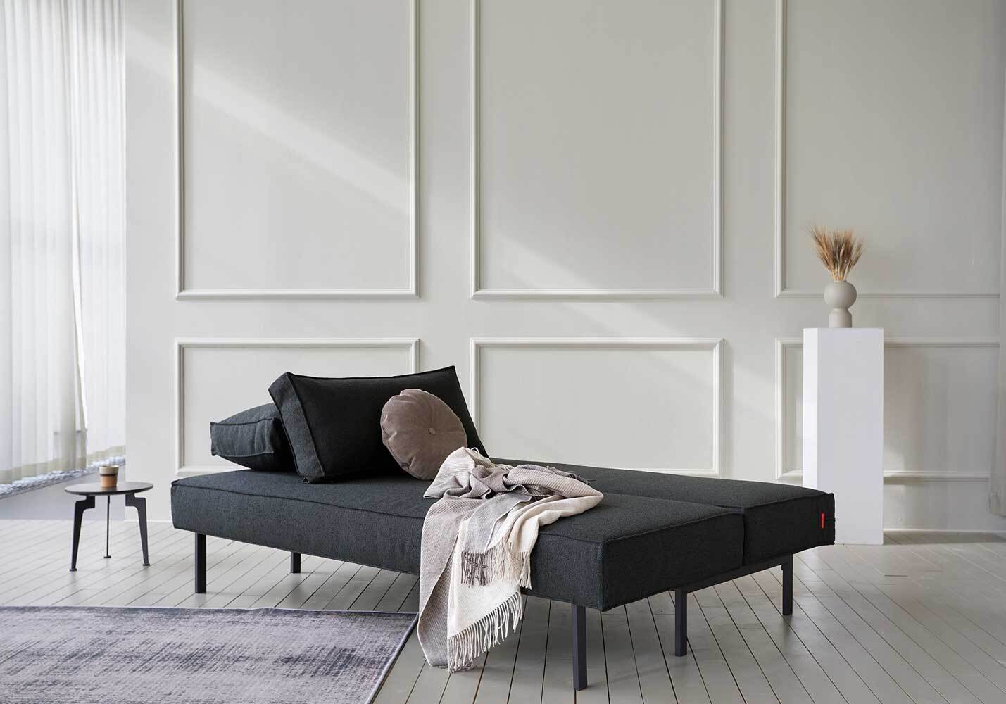 Sly is a modern sofa bed by Innovation Living inspired by industrial design, featuring matt black legs, clean lines and linear stitchings that relate to the early modernistic design era.