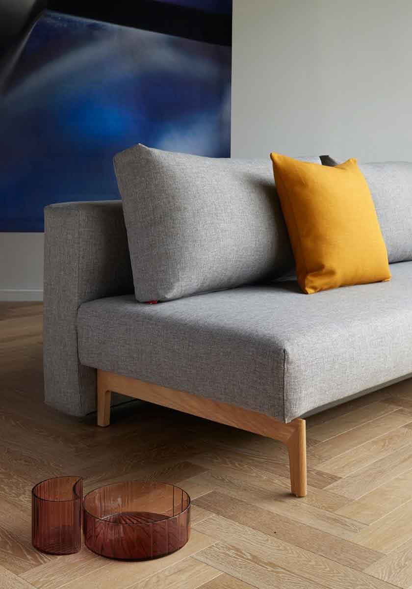 TRYM sofa elegant and unique New Nordic design with armrests in lacquered oak. The excess pocket spring mattress assure comfortable sleeping and the durable metal frame ensures a strong construction. The fabric is removable and washable.