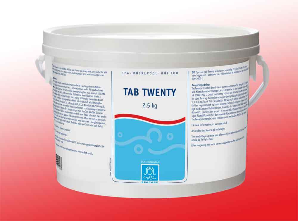 are slow-dissolving 20 gram multi-tablets which contain chlorine, flocculant, algaecide and pH stabiliser. The product ensures water hygiene in your hot tub. SpaCare Tab Twenty is placed in a tablet float or the spa's built-in dosing tube. The tablets dissolve over 4-7 days and ensure that there is always enough chlorine in the water to remove any bacteria. The tablets have a fresh smell of chlorine and are easy to use.