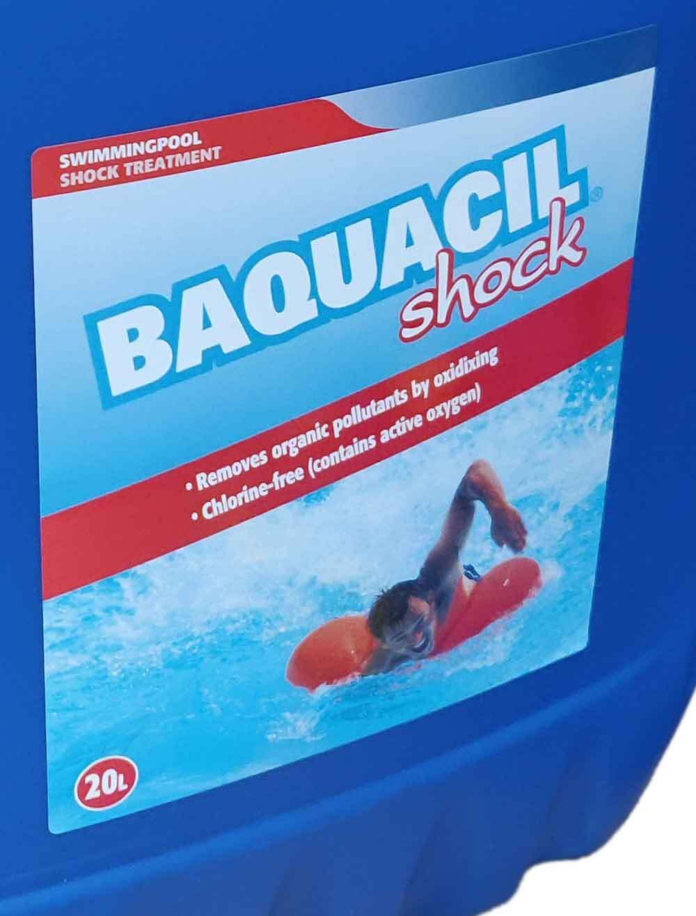 BAQUACIL Shock 20 ltr. frigiver aktivt oxygen, som nedbryder de organiske stoffer, de badende afgiver til vandet. Derfor er dette produkt helt essentielt til brug i klorfrie pools. Baquacil Shock er et nøgleprodukt til brug i klorfrie pools.