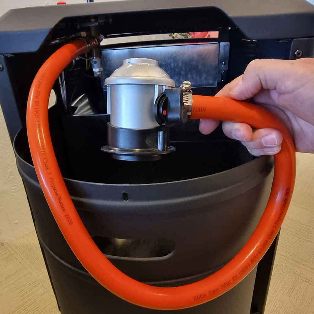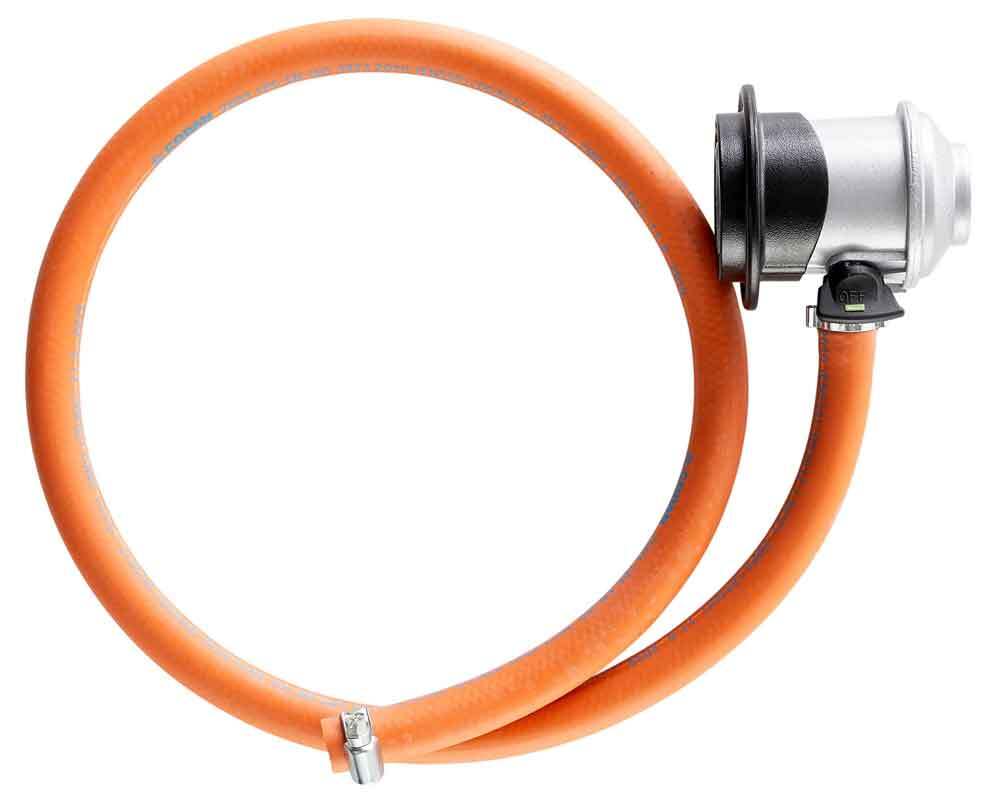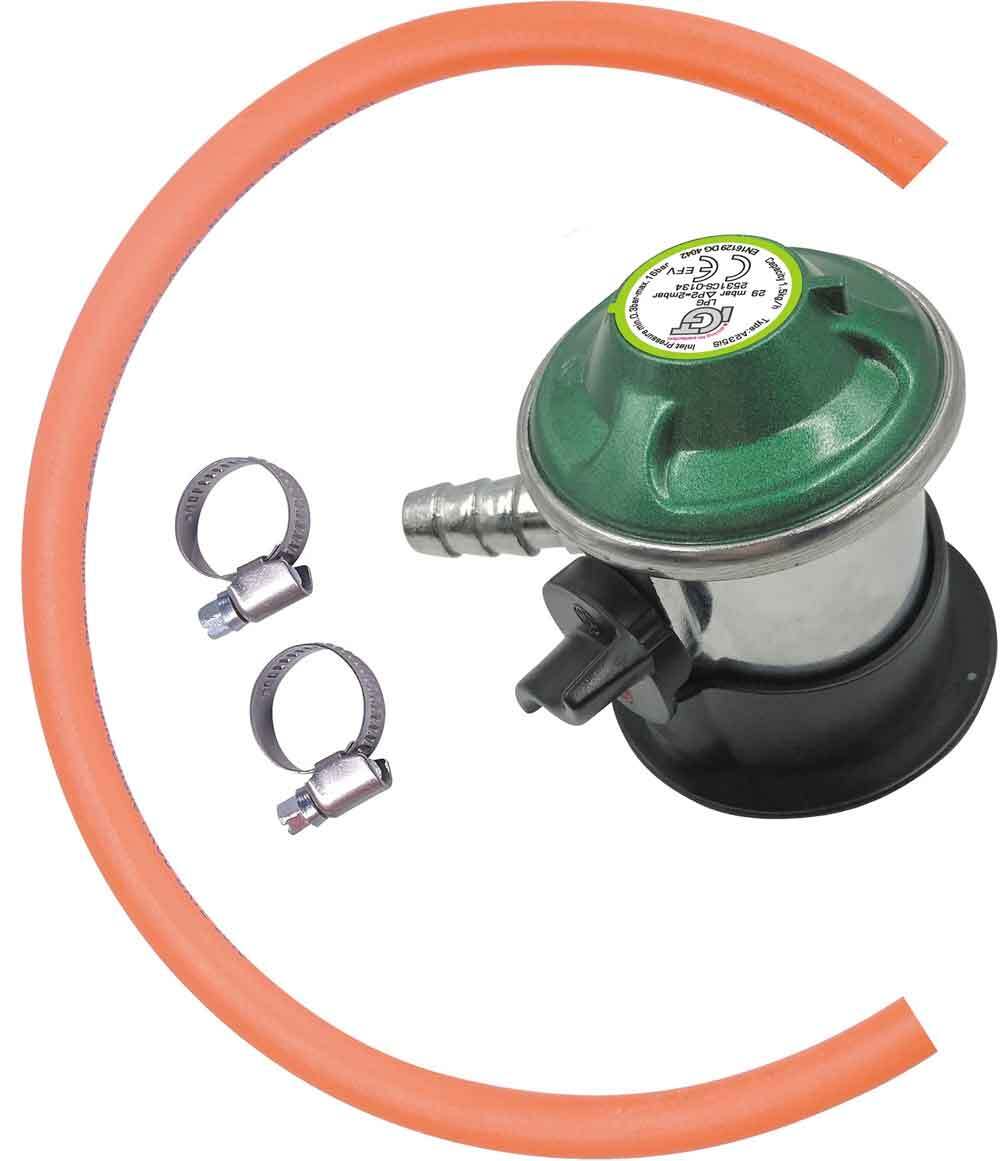 CE Godkendt gasregulator. Klar til brug. inklusiv 80 cm slange & 2 spændebånd. 30 mbar i alt. Gasregulatoren er med ON/OFF knap.
