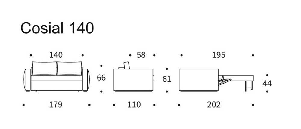 Cosial er delvist baseret på funktionsprincippet fra andre sovesofa modeller fra Innovation Living´s Compact-kategori. Den har et vandret sæde, lodret ryg og hynder i kuvertstil. En nem måde at folde fra sofa til seng som gør det til et unikt møbel, der automatisk slår benene ud, hvilket blot giver en stor og behagelig soveflade til to personer. Derudover er det en passende sofa til tre personer og gæsteseng til to, når du har venner eller familie til at overnatte. Fås i tre kompakte størrelser – 80 cm, 140 cm og 160 cm.