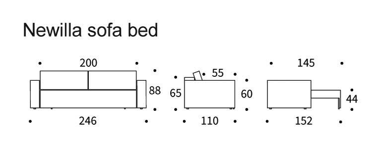 Vores Newilla sovesofa uden chaiselong tilbyder den perfekte blanding af luksus og funktionalitet. Størrelsen på vores Newilla sovesofa er perfekt egnet til mindre rum, der måler 145x200 cm i liggeområdet. Det er en alsidig tilføjelse til dit opholdsrum, der giver et behageligt sted til afslapning og rummer dine gæster til en god nats søvn.