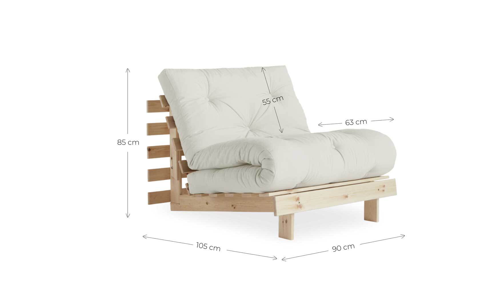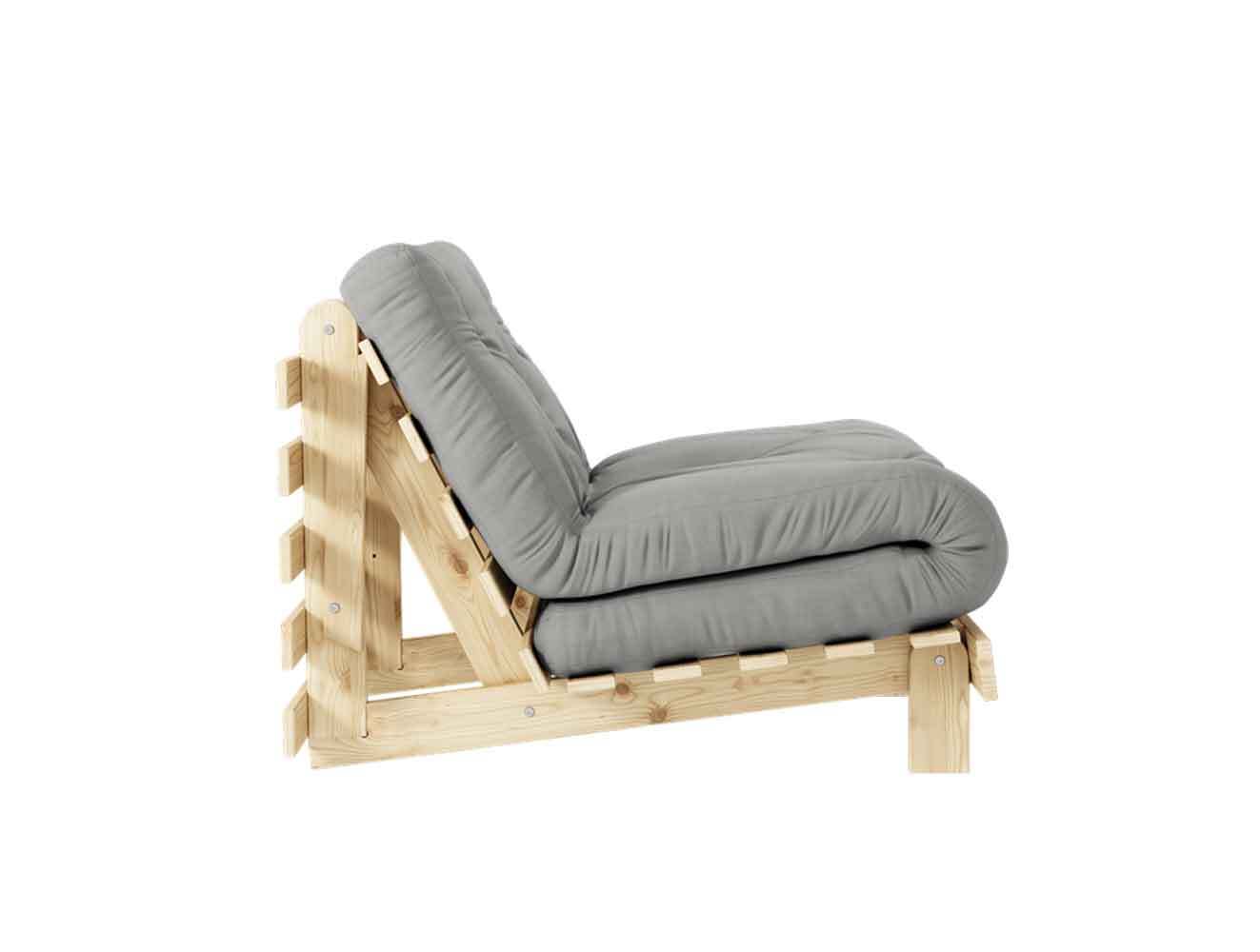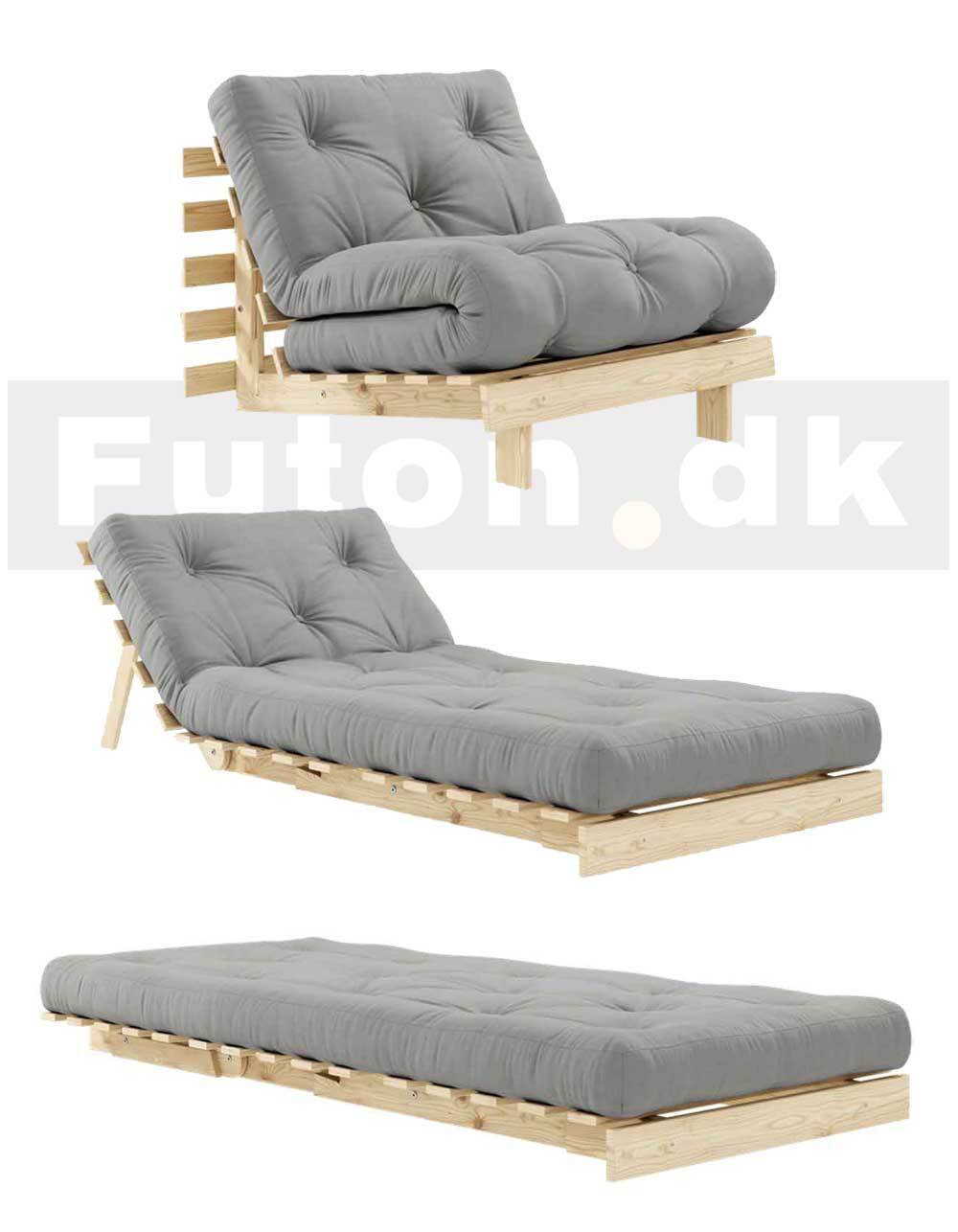 Roots futonstel 90x200 cm - inklusiv madras i valgfri stof. (ikke aftageligt betræk). Du får ikke kun en sofa, men også en dobbeltseng med mulighed for at hæve et behageligt ryglæn, hvor du kan lade op samtidig med, at du opretholder en god jordforbindelse. Fold ryggen dobbelt op, fold madrassen over, og du har nu en loungestol i almindelig højde