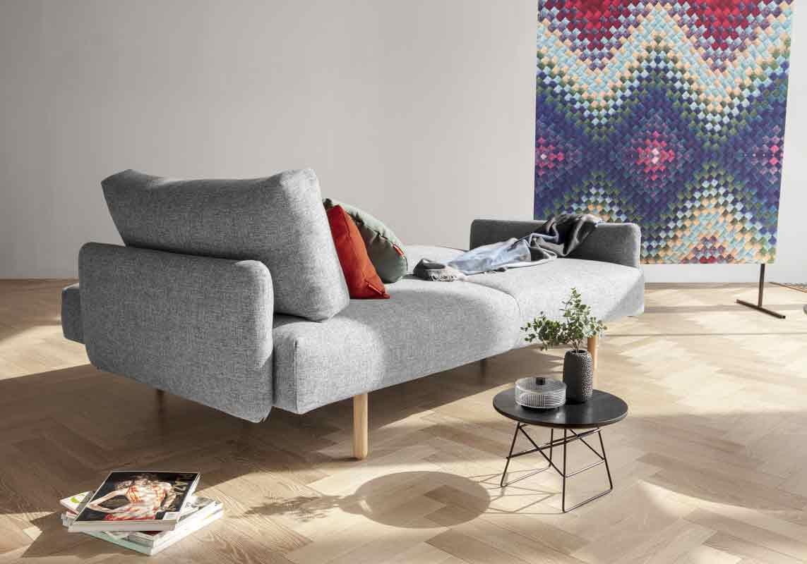 FRODE sofa med ARMLÆN og STEM ben i lyst træ. Inklusiv sengetøjmagasin og 2 rygpuder.