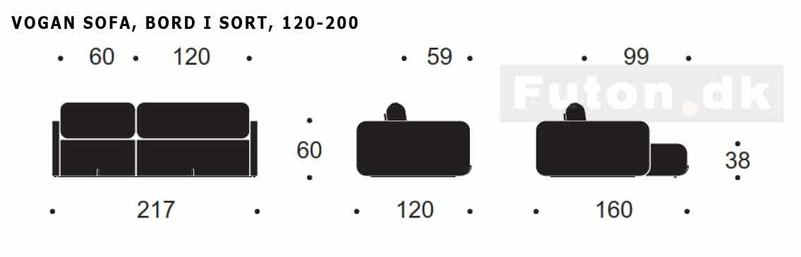 VOGAN sofa med bord i sort, 120x200cm. Valgfrit tekstil~stof.