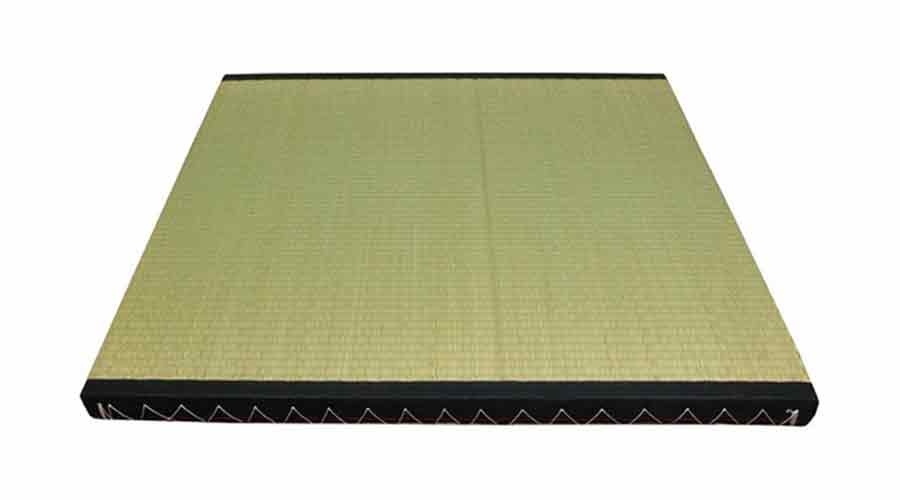 Tatami måtte af risstrå. (Overflade Nr.2 og kantbånd Nr.1 Sort). Tatami måtterne fremstår i starten som grønne, men efter noget tid bliver overfladen den flotte gule farve. Bagsiden er med Japansk møl sikkert papir.