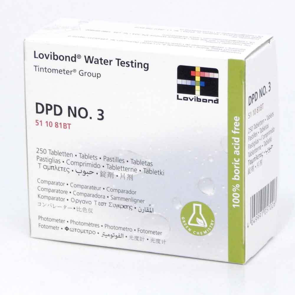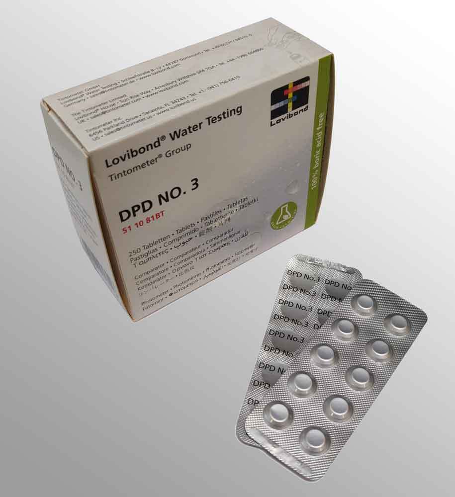 Lovibond® DPD nr.3 Total klor - til Photometer. Med disse kan du foretage en måling af total klor i en Photometer SmartTester. Pakken indeholder 250 tabletter.