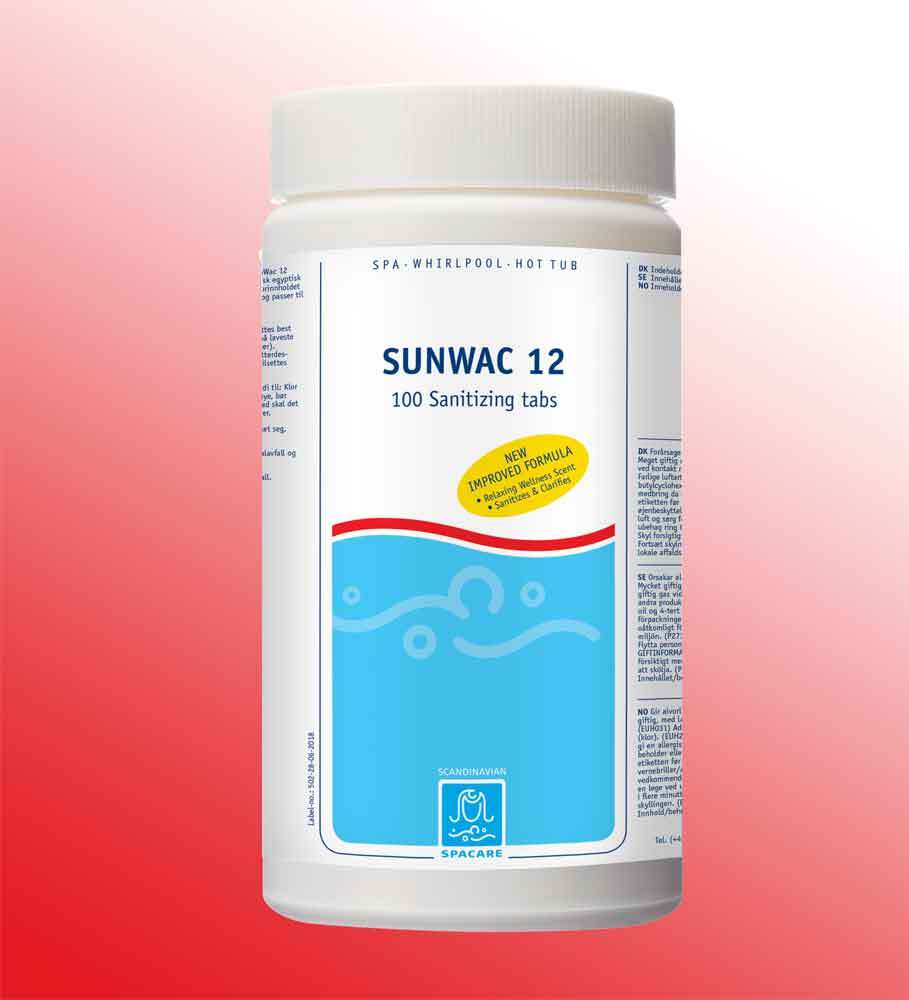 Spacare SunWac 12. 100 tabs. 1000-3000 liter vand. SunWac 12-tabletterne er Skandinaviens mest solgte klortablet og er storebror til SunWac 9. Med SunWac 12 får du rent og velduftende vand i dit spabad.
